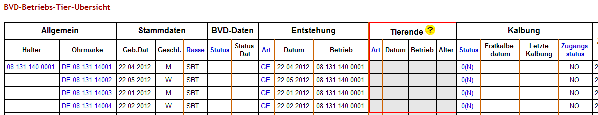Geschlecht) und der BVD-Status ausgegeben. Er wird ermittelt auf Basis der