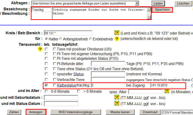 =>Eingabe der Suchparameter ( z.B. trächtig zugegangene Tiere)