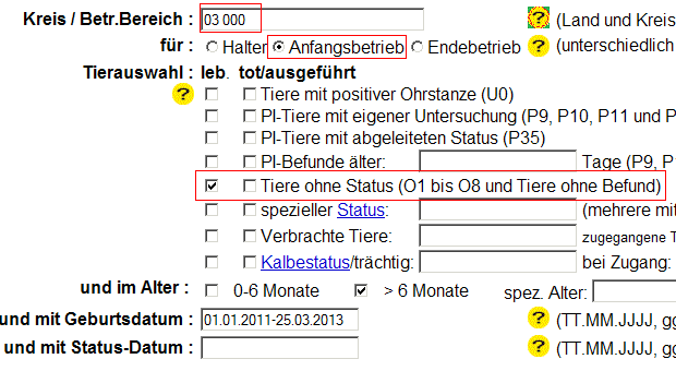Die Suche umfasst Tiere mit einem O-Status (O1 bis O8) und ohne Untersuchungsergebnisse.