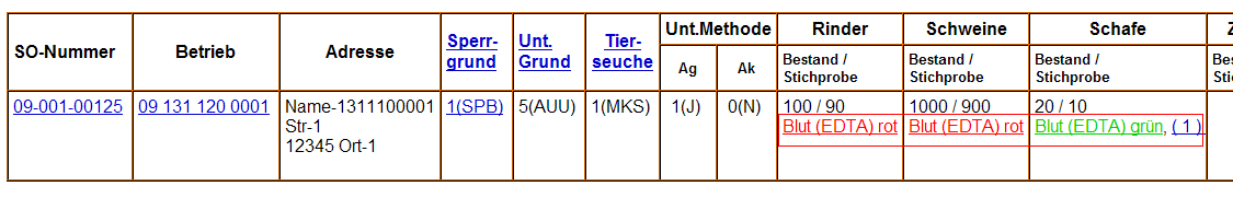 FormDie Rohdaten sind die aus dem Krisen-Explorer der lokalen TSN-Anwendung exportierten Daten zum Untersuchungsauftrag, wie Seuchenobjektnummer, Sperrgrund, Tierseuche, Untersuchungsgrund /-methode, Probenmaterial und Bestandsgröße bzw. Stichprobenumfang. Standardeinstellung ist die aufbereitete Form "Daten zum Untersuchungsantrag"; sie zeigt zusätzlich den Bearbeitungsstatus des Untersuchungsauftrags an und umfasst zusätzlich die Betriebsanschrift. Ist ein Auftrag bereits erstellt worden, ist das Probenmaterial grün markiert und die Anzahl der generierten Untersuchungsanträge wird angezeigt. Rot bedeutet noch unbearbeitet. Der Link dient zum Aufruf der Maske zur Erstellung des Untersuchungsformulars. Um nicht bei jedem Untersuchungsantrag den Tierarzt, Labor und das Probenahmedatum angeben zu müssen, sollten vor Anzeige der Daten zum Antrag die entsprechende Angaben vorzufüllen. Beim Aufruf der Maske zum Untersuchungsantrag werden diese Daten automatisch eingefügt. Tierarzt-BNRDie 12stellige Betriebsnummer des Tierarztes, der die Untersuchungen durchführt, ist hier einzutragen. Die Angabe wird automatisch beim Aufruf der Antragsmaske übernommen. LaborDie 12stellige Betriebsnummer des Labors ist hier einzutragen, wenn die Angabe automatisch beim Aufruf der Antragsmaske übernommen werden soll. ProbenahmeDas Datum der Probenahme ist hier einzutragen, wenn die Angabe automatisch beim Aufruf der Antragsmaske übernommen werden soll.